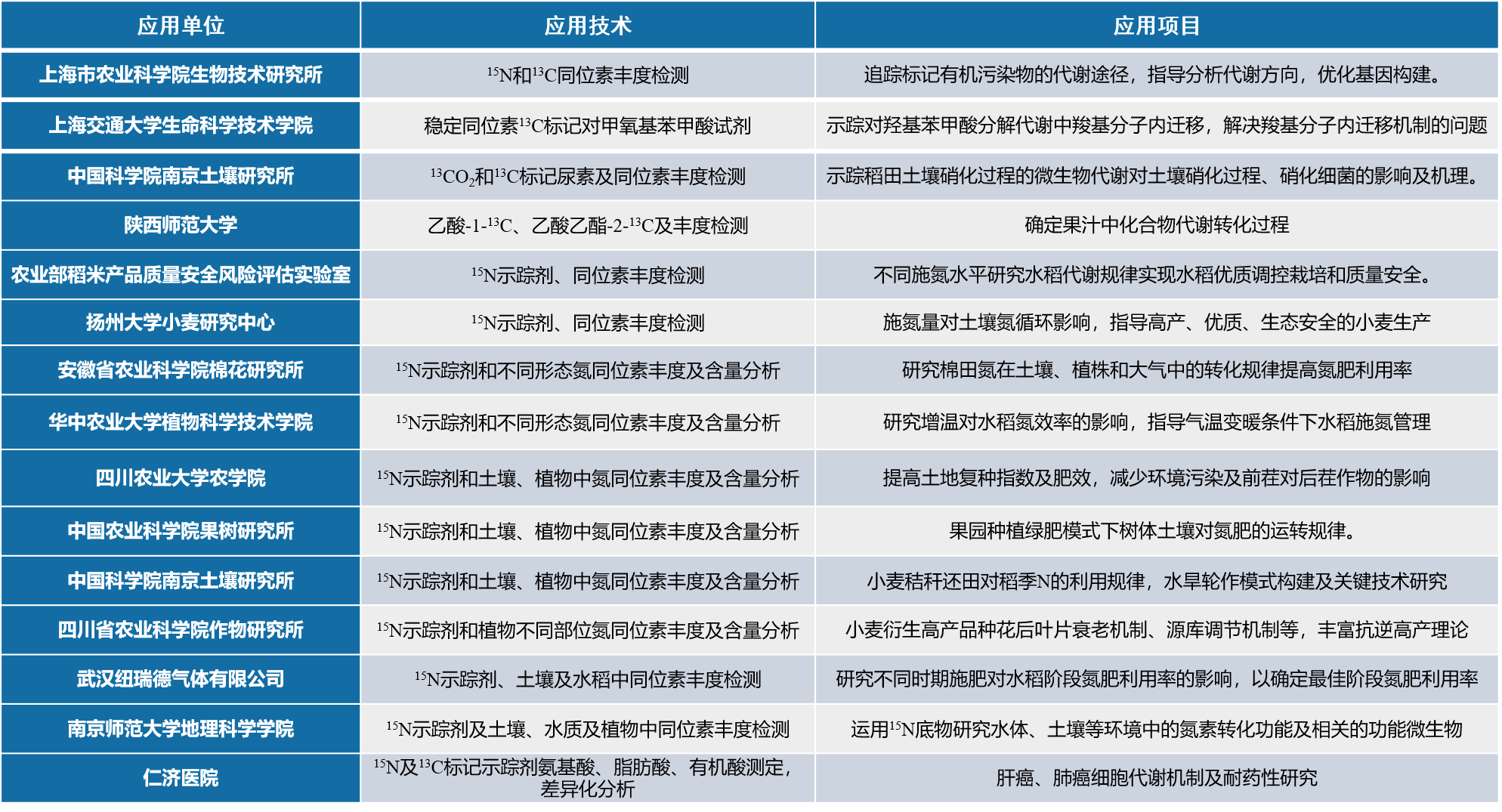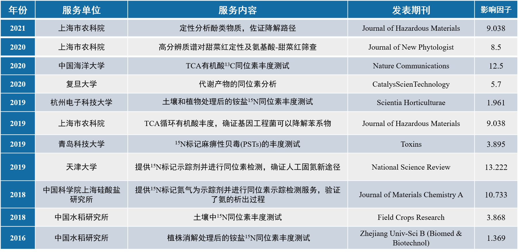 团队致力于国产化试剂的应用推广,所开发的生物及临床样本代谢物的同位素丰度及含量的检测方法,不仅为国产化试剂提供了成果应用示范,还依托上海市大型仪器服务平台为生态环境、现代农业、生物医药领域的五百余家医院、高校、科研院所及企业提供了上万次技术服务,部分应用案例见表1,相关科研成果为高水平论文的发表提供了有力同位素技术支撑,部分论文成果见表2。